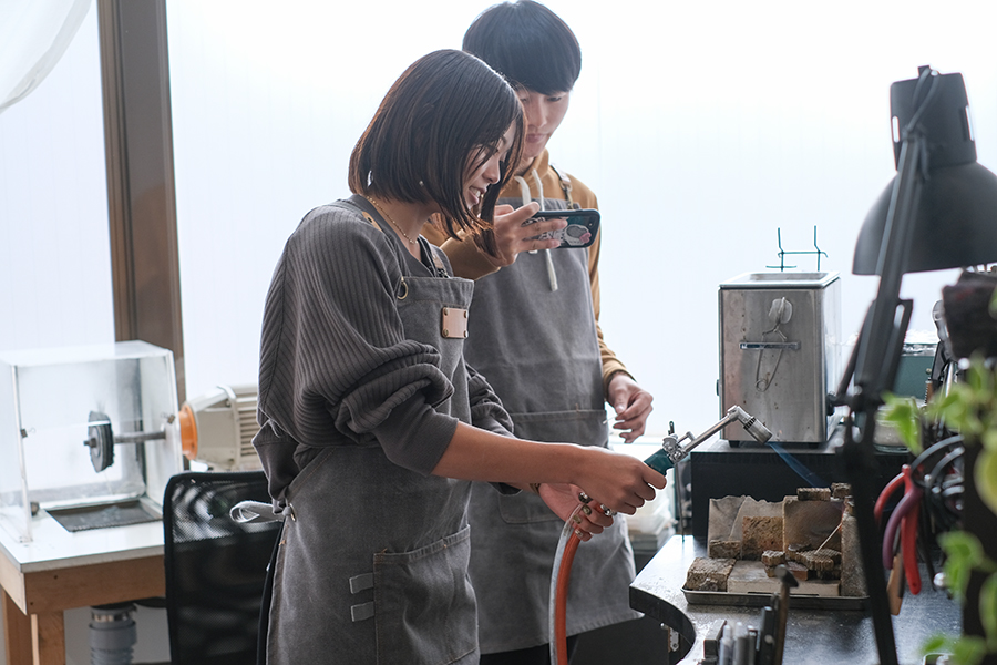 「これで大丈夫かな…?」と少し不安そうにお互いの指輪の状態を確認し合うお二人。ここでは綺麗な丸い形を作ることよりも、棒の端っこ同士をいかに隙間なくピッタリと合わせていくことの方が実は重要なんです。粘土や細いワイヤーのような素材とは異なり、太さもそれなりにある無垢の金属を思い通りに曲げていくのは中々難しかったと思います。お二人とも頑張って目標の形を目指し作業されていらっしゃいましたね。