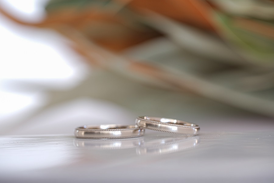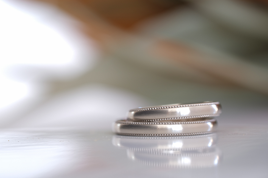 温かみのある色合いが魅力であるホワイトゴールドの素材に、艶感がほんのりと感じられるセミマットの仕上げと”ミルグレイン”という小さな粒が連なった装飾を加えたデザインをお選びになったお二人。ミルグレインを両サイドに施すことで小さな丸い粒ひとつひとつに立体感が現れ、グッと存在感を放つ結婚指輪になりました。