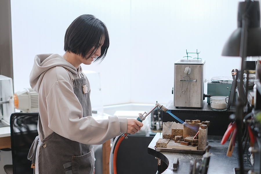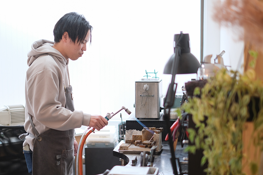ガスバーナーでお二人が何をしているのかというと、材料を熱して柔らかく加工する「焼きなまし」という作業を行っております。