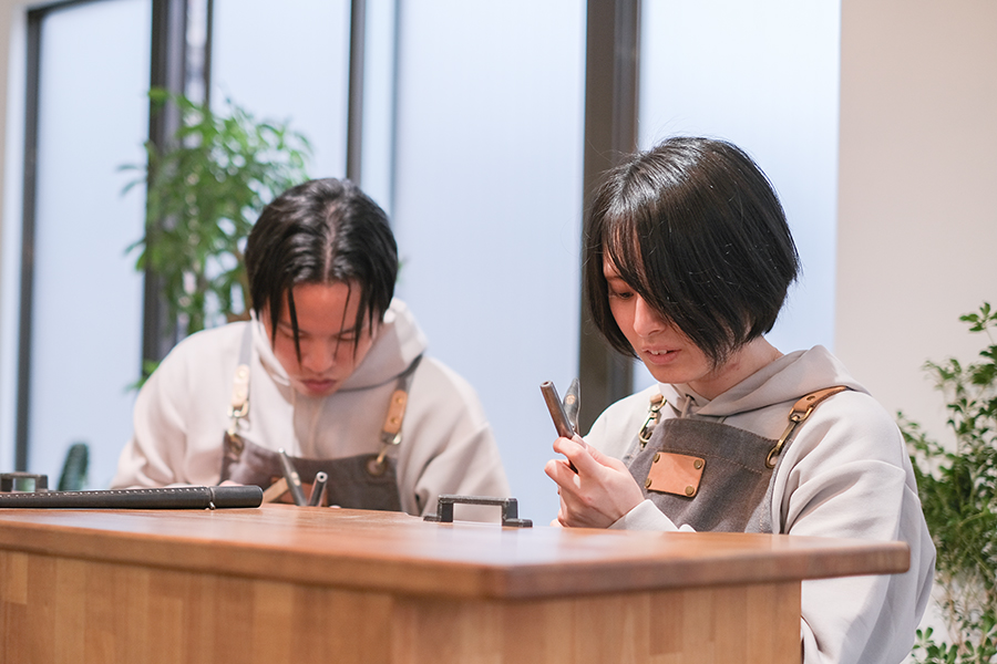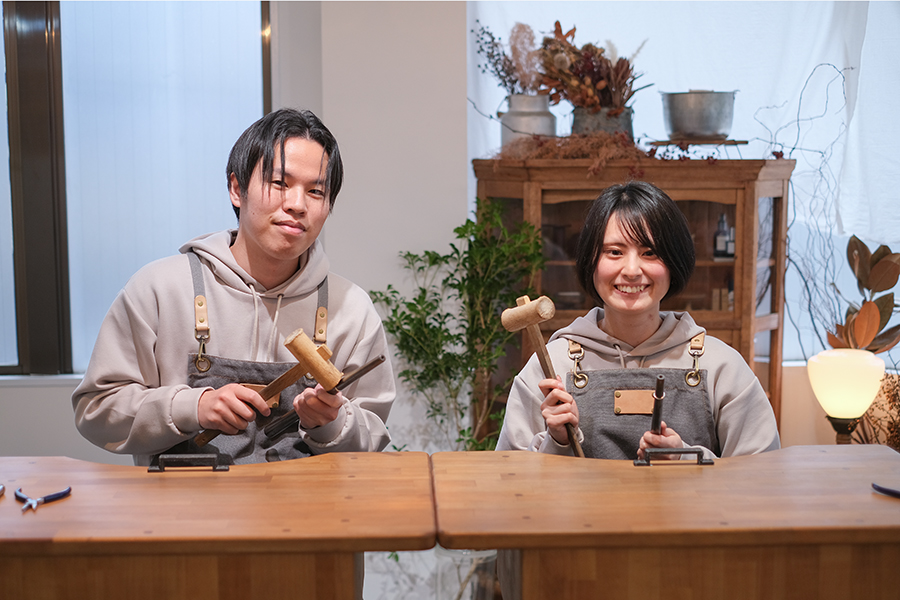 また模様付けは金槌のアタリの強さや角度がそのまま模様に反映されてくるので、お二人とも初めは数回打っては模様の確認…とドキドキのご様子でしたね。繰り返し繰り返し模様付けを作業を積み重ねていくことで、自分にぴったりのデザインに。