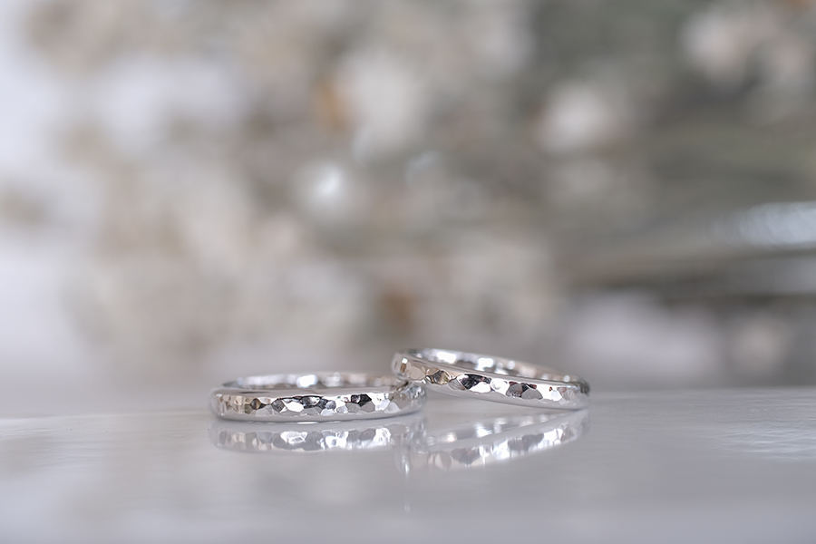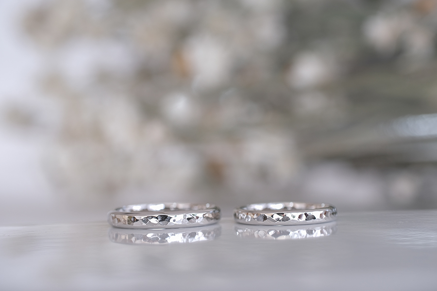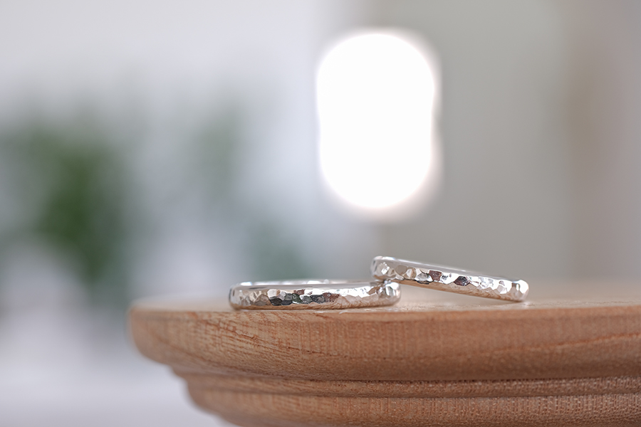 今回ご紹介するお二人が結婚指輪に選んだのは“槌目”という、金槌でひとつひとつ模様を打ち込んだデザインが盛り込まれたもの。金属ならではのキラリとした輝きと、模様の強弱により生まれる手仕事ならではのゆらぎ感が非常に魅力的な結婚指輪となりましたね。