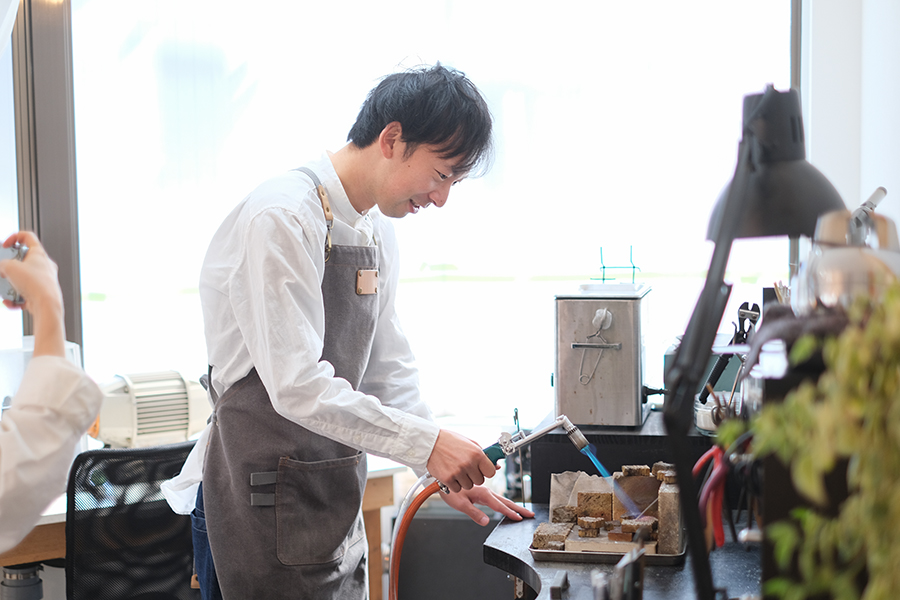 ガスバーナーを使って材料を温める作業を行っていただきました。