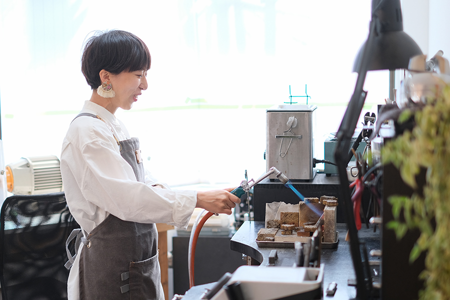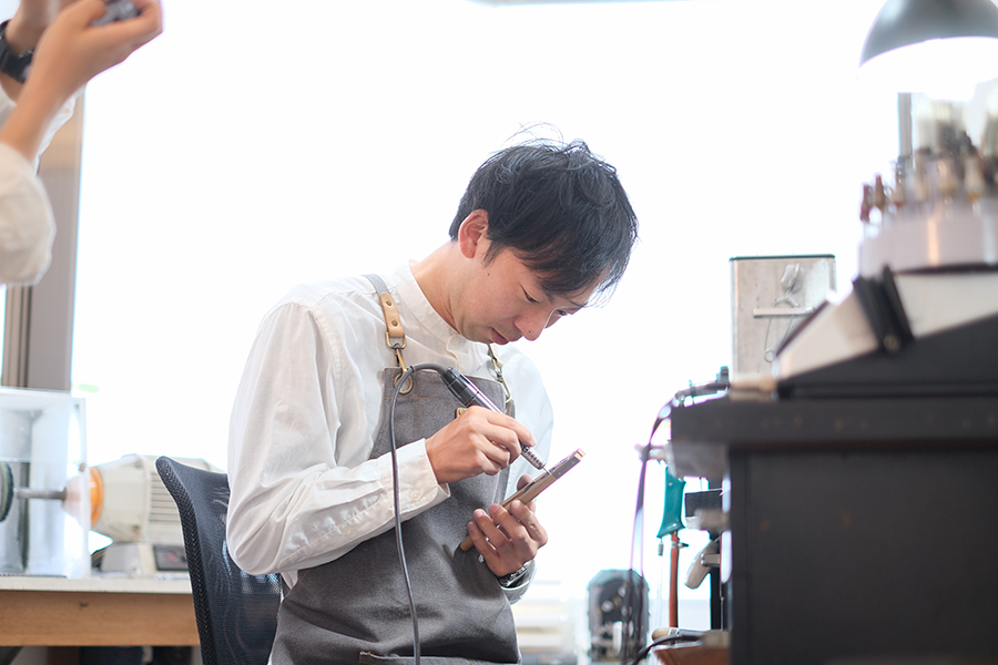 また、ここで模様と同じくらい大切なのが指輪のサイズ感。叩きすぎてしまうと希望のサイズよりも大きい指輪になってしまうので、模様を入れていくのと同時に指輪のサイズがどれくらいになっているかもチェックしながら作業を進めていただきました。模様付けの「カンカン」というハンマーを振る音が、アトリエの中に軽快に響き渡ります。