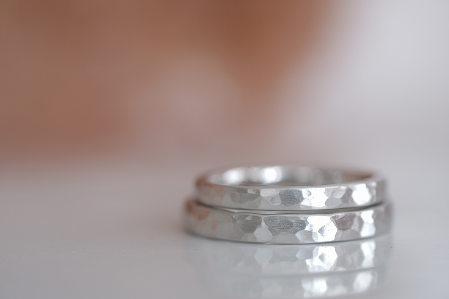 柔らかな質感の中に時折煌めく、槌目模様の手作り結婚指輪
