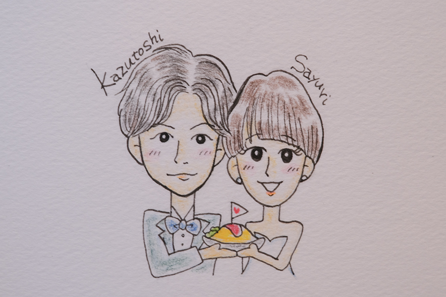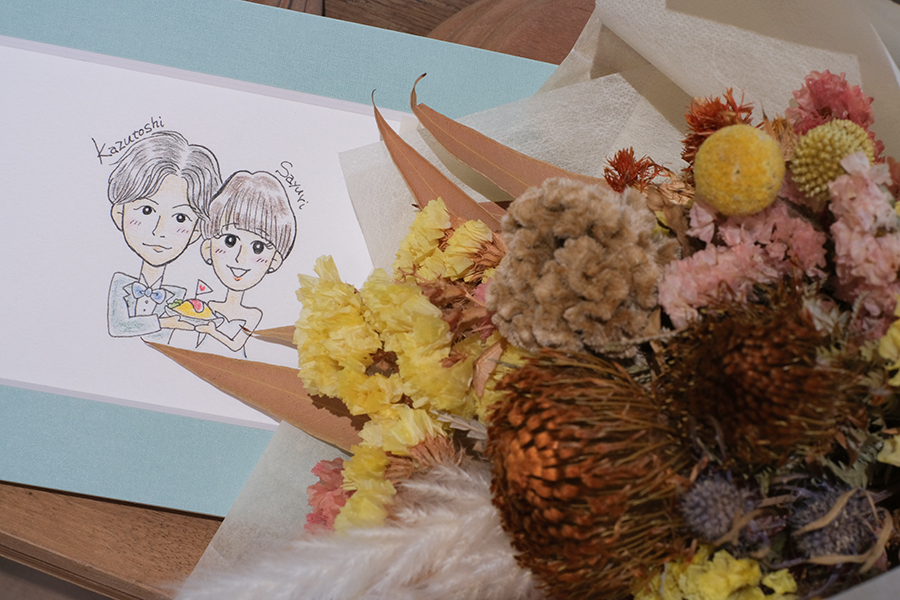 完成した結婚指輪と共に、お二人の似顔絵とドライフラワーでお作りしたブーケをお渡しいたしました。インテリアとしてはもちろん、結婚式のウェルカムスペースなどを彩るアイテムとしてもご活用いただけます。お二人のこれからの日々を共に彩ってくれるアイテムとなりますように。