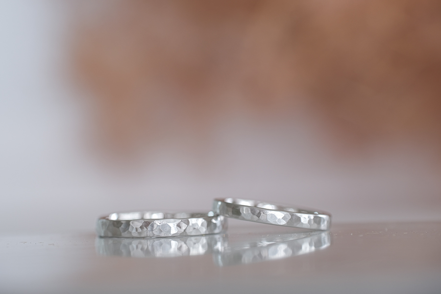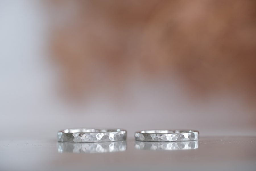 柔らかな質感の中に時折煌めく、槌目模様の手作り結婚指輪
