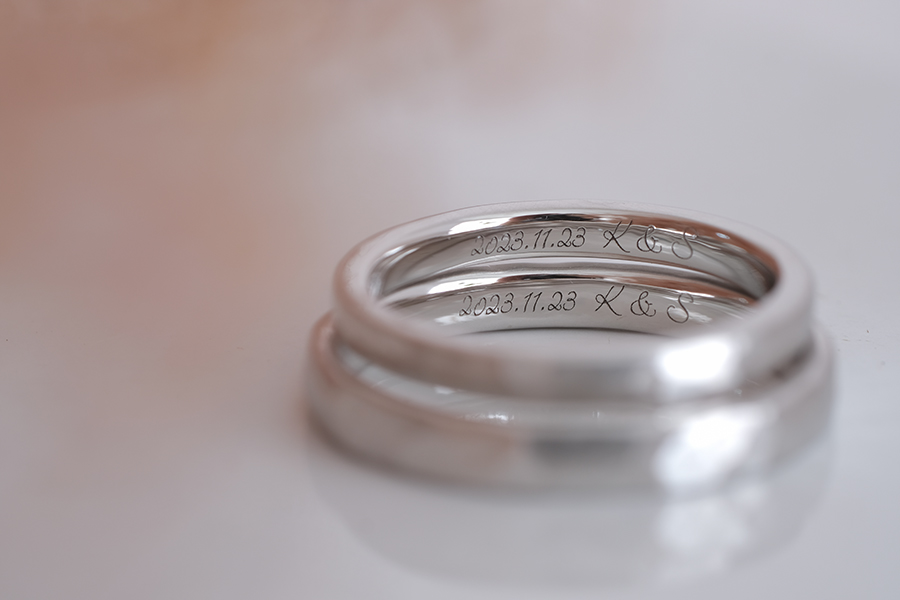 柔らかな質感の中に時折煌めく槌目模様の結婚指輪、お二人の穏やかな雰囲気にとてもよくお似合いになっていらっしゃいました。またメンテナンスなどご機会ございましたら、またお二人にお会いできるのを楽しみにしております。